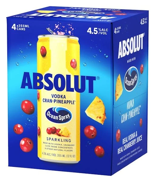 Absolut Vodka Ocean Spray Cran-Pineapple canned cocktails are inspired by the classic combination of Absolut Vodka and Ocean Spray Cranberry Juice. This iconic collaboration between Absolut Vodka and Ocean Spray delivers a ready to drink sparkling vodka cocktail with the refreshing taste of tropical pineapple and juicy cranberry in a convenient format that is ideal for sipping and perfect for sharing. These real cran-pineapple juice mixed drinks offer a sweet twist on the Absolut VodkaÂ