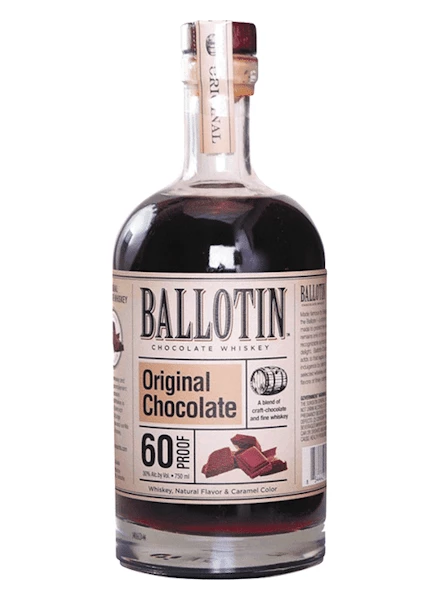 A blend of craft-chocolate and fine whiskey. Whiskey, natural flavor & caramel color. These distinctive whiskey and chocolate pairings complement and elevate any occasion. Ballotin Chocolate Whiskey is deliciously smooth, with rich flavors of chocolate fudge mingling with the oak and vanilla undertones of the whiskey. Distilled from grain.