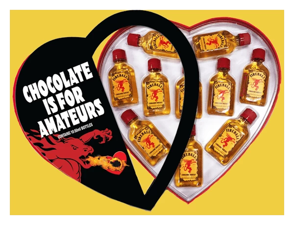 Leave it to Fireball to take a corporate holiday and turn it on its head with a cupid is stupid heart shaped box pre-packed with 10pk 50mls. After all, chocolate is for amateurs.